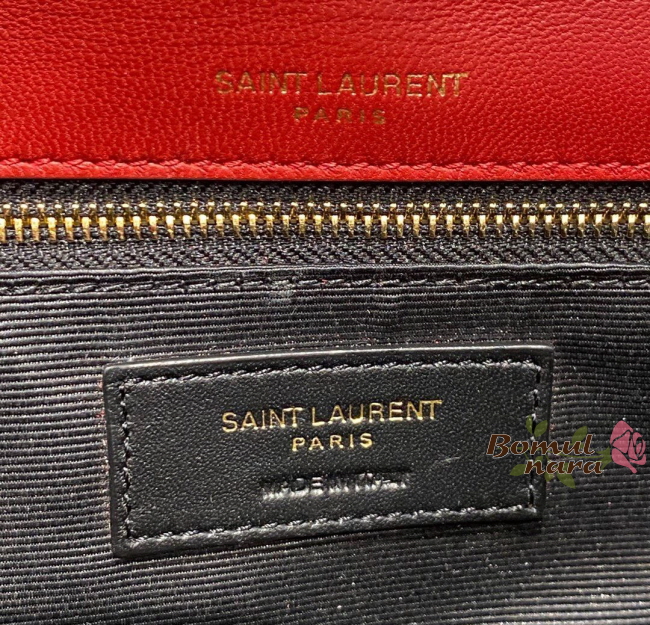 메탈 YSL 이니셜과 체인 태슬로 장식되어 있으며