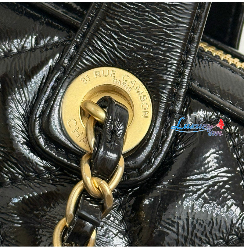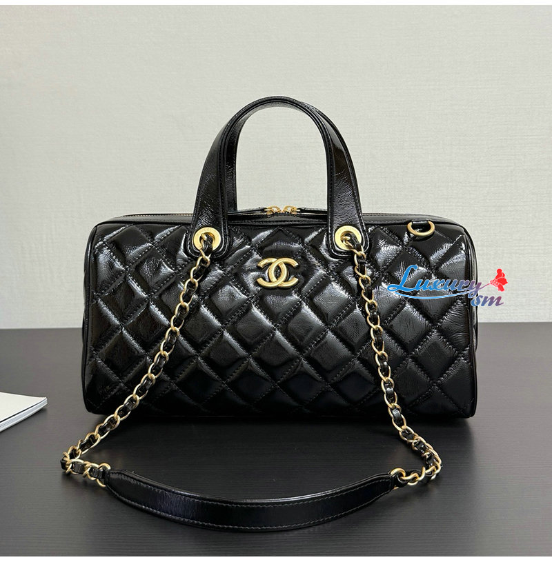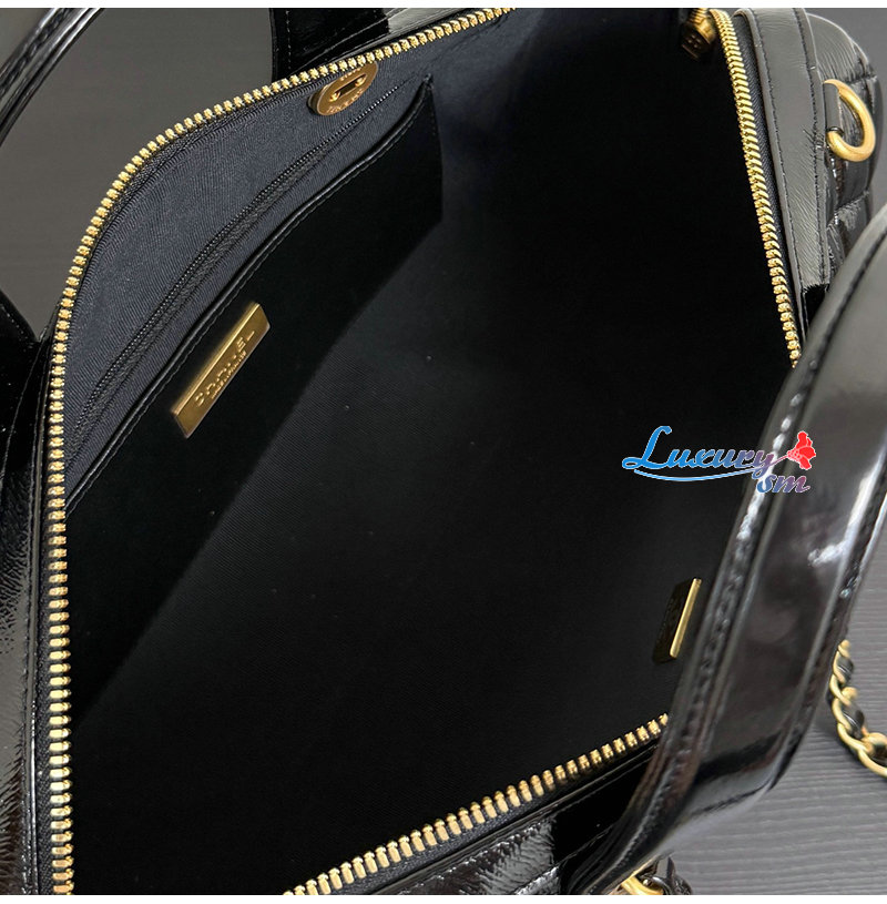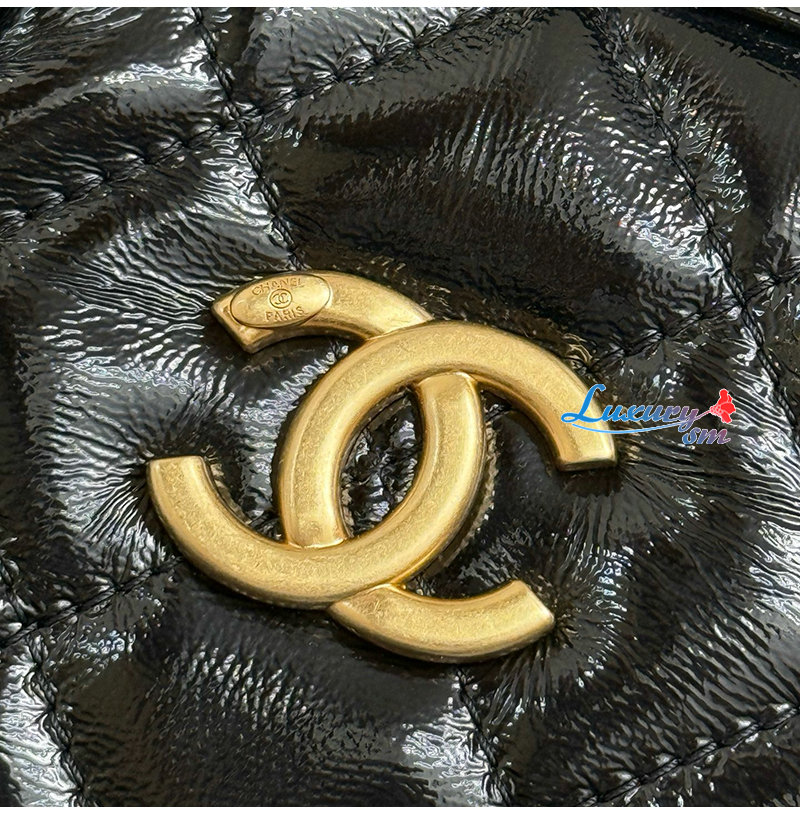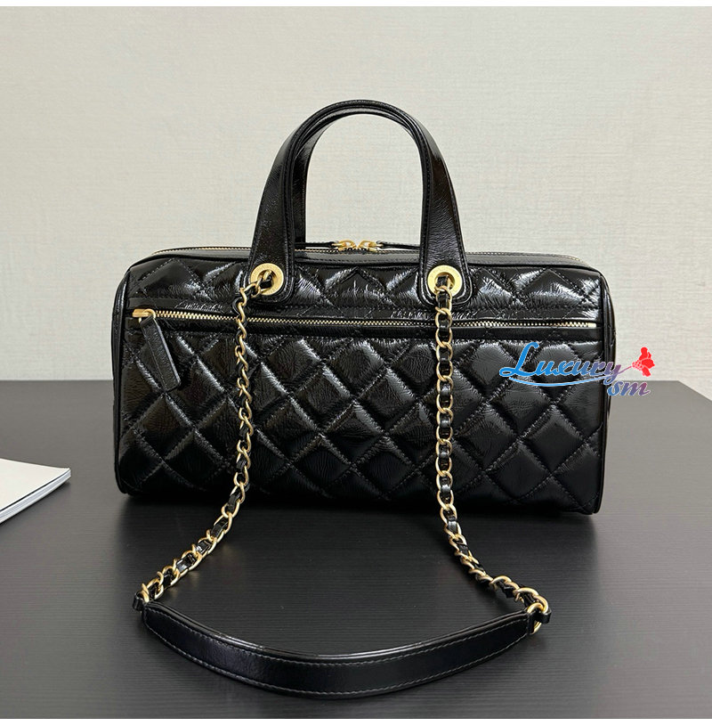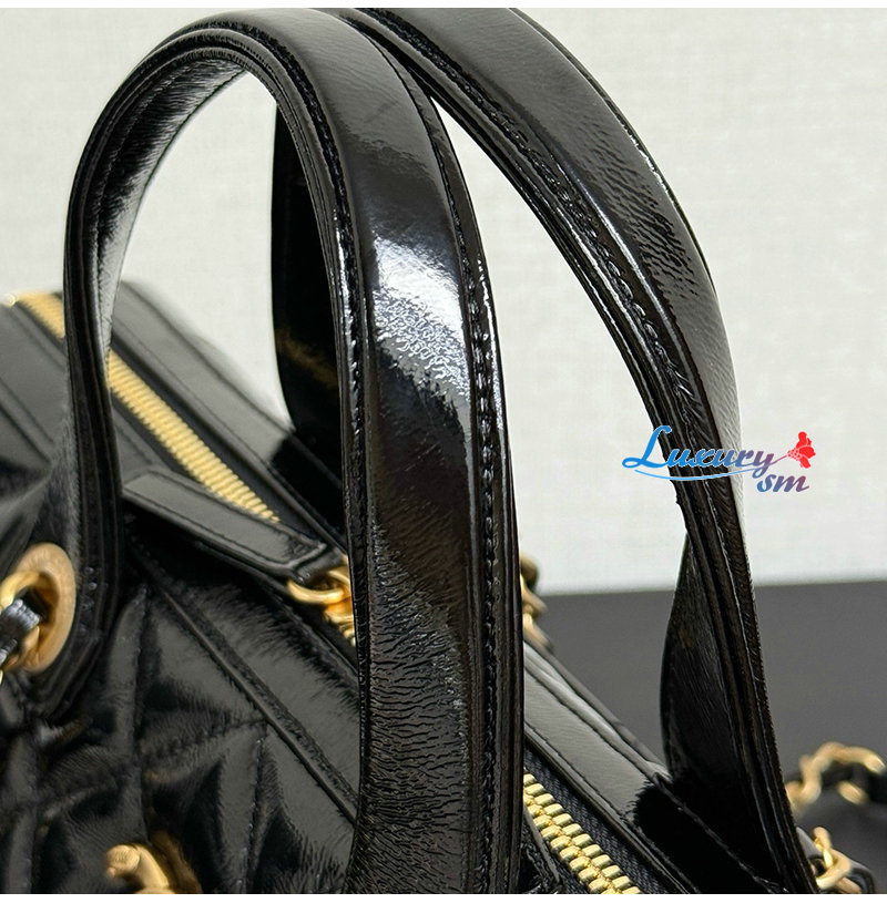 페이던트 가죽에 볼링백 실루엣이 조화를 이루며, 빈티지