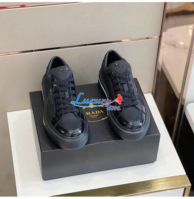 PRADA-2EG376 프라다 블랙 매크로 리나일론 브러시드 가죽 스니커즈