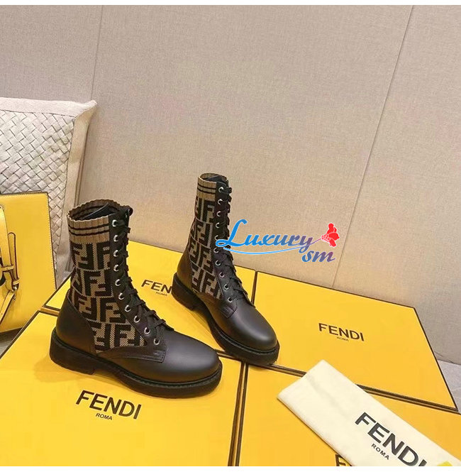 FENDI-8T6780 펜디 블랙/브라운 송아지 가죽 더블 F 패브릭 로코코 바이커 부츠 여성용