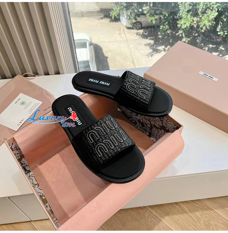 MIUMIU-5XX644 미우미우 블랙 라피아 우븐 패브릭 슬라이드 여성용