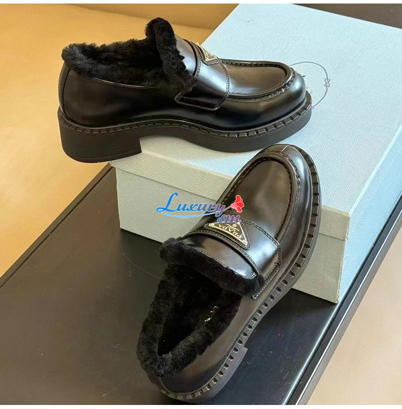 프라다가 클래식 로퍼를 둥근토와 부드러운 시어링